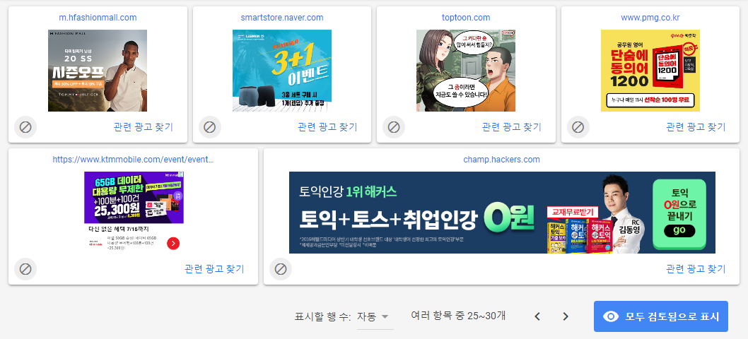 나는 쓸데없는 탑툰 성인 광고를 찾았고 해당 광고의 '관련 광고 찾기' 버튼을 클릭한다. 그러면 아래처럼 관련된 광고가 나오는데 우측 상단의 '모든 차단' 버튼을 클릭하면 더 이상 뜨지 않을 것이다.