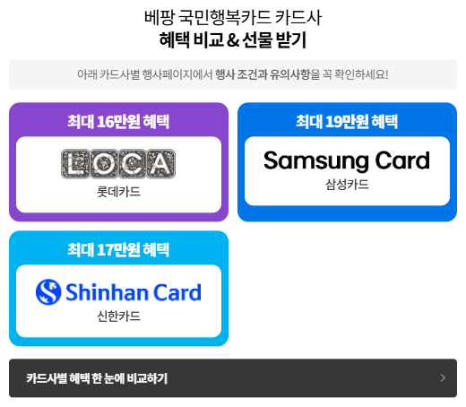 아래와 같이 카드사 선택 창이 나타나는데 카드사별 혜택 한 눈에 비교하기를 클릭해서 살펴보는 것이 좋다.