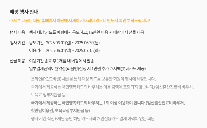 대개 롯데카드, 삼성카드, 신한카드가 가장 많이 이용하는 카드사인 것 같고 우리가 신청할 때는 기존에 사용하던 삼성 신용카드가 있던 상태라 롯데카드로 신청했다. 그리고 카드사별 사은품을 비교해보고 아래 이미지와 같이 행사 안내도 되어 있는데 각 달마다 행사 기간이 조정되는 듯 하다.
