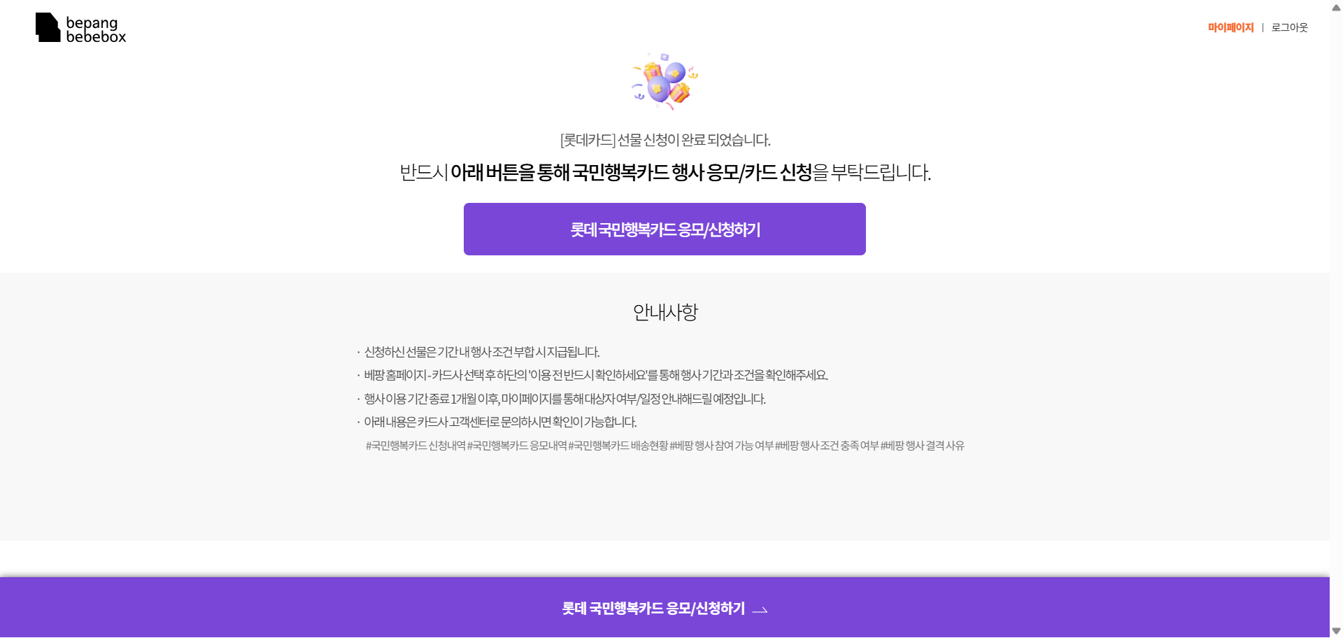 간단한 정보만 기입하고 카드 신청 페이지로 넘어간다. 이후는 온라인에서 카드 신청하는 절차와 동일하며, 선물 신청 현황은 마이페이지에서 확인 가능하다.